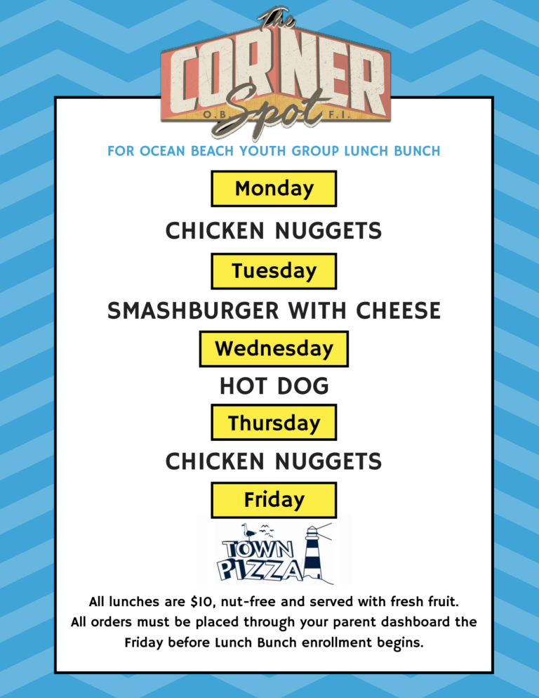 A: YES! We are so excited to launch a new pre-order bagged lunch option. OBYG has partnered with The Corner Spot and Town Pizza to offer a menu of lunch options Monday-Friday for an additional $10 per camper. You must enroll for this lunch option on Campsite as an “enrollment extra” the Friday prior to your child joining Lunch Bunch. All lunches are nut-free and served with fresh fruit. See below for the weekly menu options!